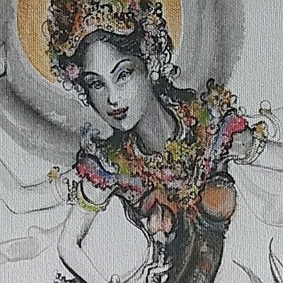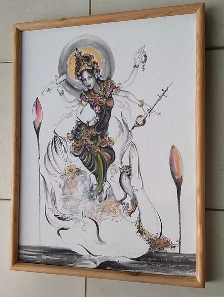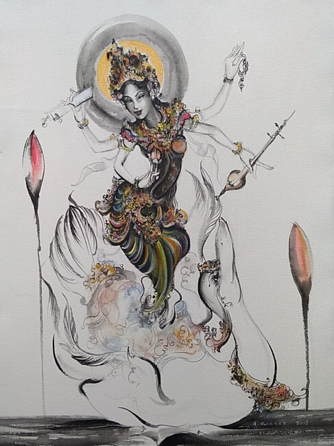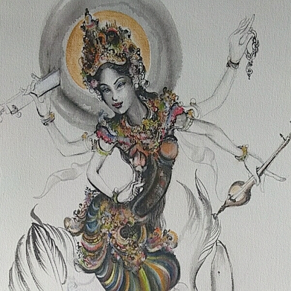 学芸全般を守護する女神サラスワティが、流麗な筆使いで豪華絢爛に描かれています。黒の濃淡だけで表現した作品ですが、こんな妖艶な姿態の女神様は見たことがありません。持ち物や乗り物をじっくりと観察して、ようやく女神サラスワティ様だと納得いたしました!