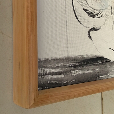 この作品は木目の美しい透明ニス塗りの木製額縁に入れてお届けします。