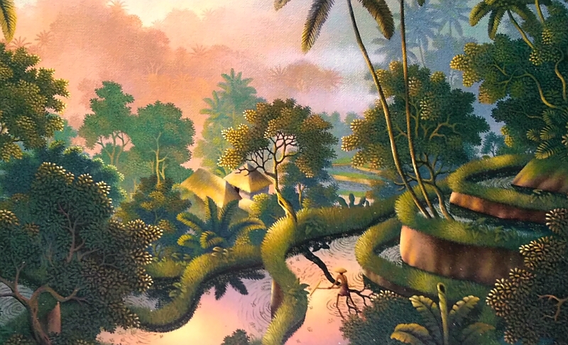 Warditaさんの住むパヤンガン村はキンタマーニ高原の南山麓にあり、当にこの絵のような棚田風景が広がる山間の美しい土地でした。山間の棚田に朝陽が差し込む一瞬前のひんやりとした静寂な空気が閉じ込められた珠玉の作品です。