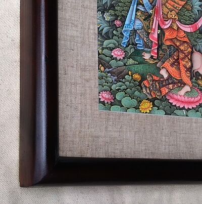 ヒンドウ経の聖典ラーマヤナ物語の主人公ラーマ王子とシータ姫が森を彷徨う姿が、濁りのない美しい配色のグラデーションと、線の一つ一つが巧みな筆使いでくっきりと描写されています。腕の良い細密画の職人画家による貴重な逸品。