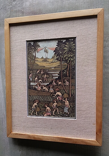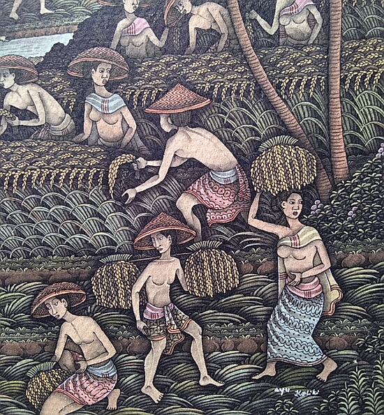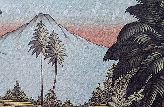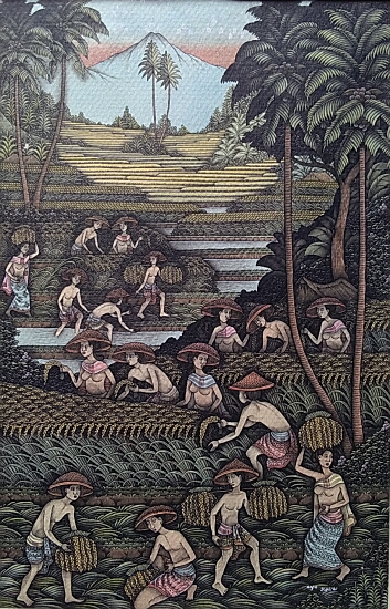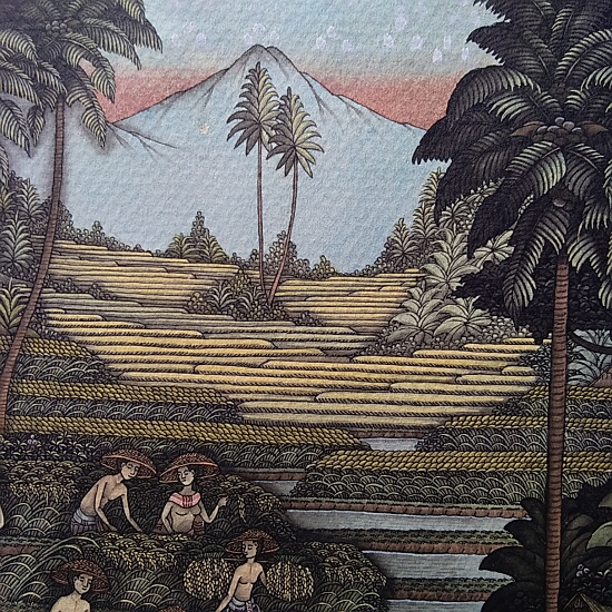 バリ島の山間の棚田の稲刈り風景が、正確な遠近法の柔らかな描線で描かれていますね!霊峰アグン山が雲海の遥か彼方に鎮座する姿や、周りの空の色合いには「北斎」風の趣が感じられますが如何でしょうか?作家のAyuさんは名前からすると女性画家です。