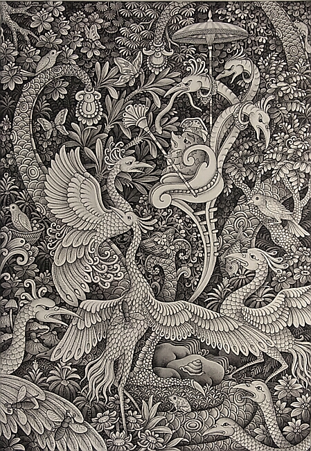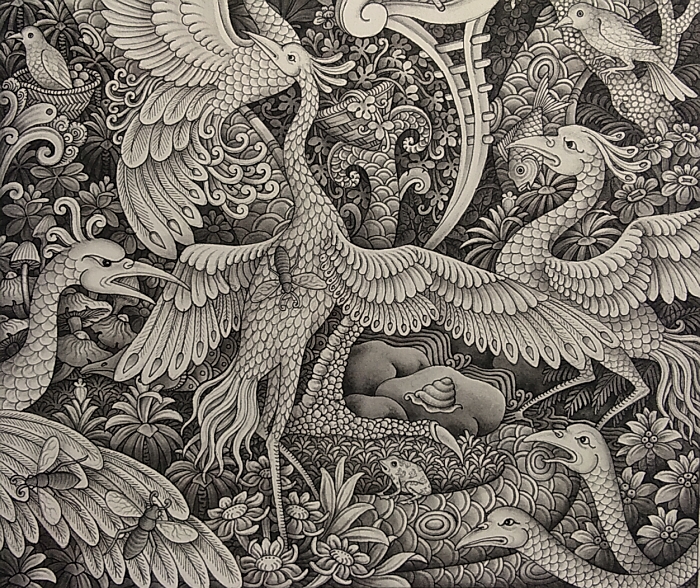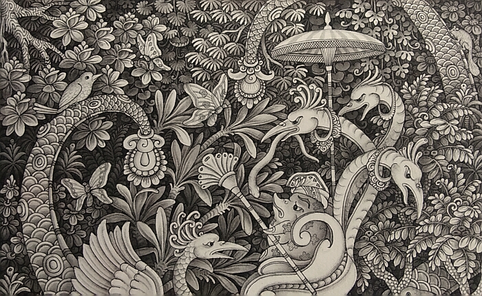 バリ島の原野に生息する野生動物たち(白鷺、野鳥、カエル、リス、ミツバチ、蝶、ウナギ、魚など)の世界を、カエルの姿をした王様が白鷺の作った御輿に乗って辺りを睥睨している愉快な作品です。