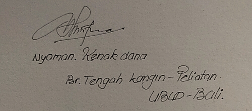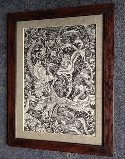 DANAさんの絵を初めて見たのはウブド郊外の額屋さんでのことでした。バリ島農民の風俗習慣と民話が風景に溶け込んだ細密画となって描かれ、一目見て氏の伝統絵画作品の味わい深さに心を打たれました。氏のユニークな発想と人柄がにじみ出ている逸品です!