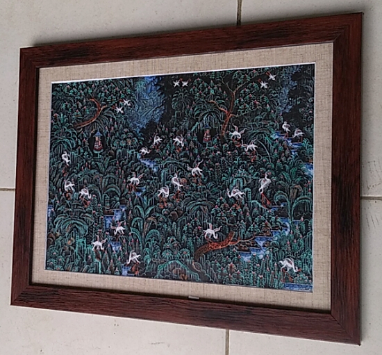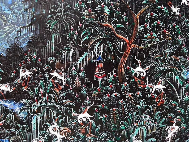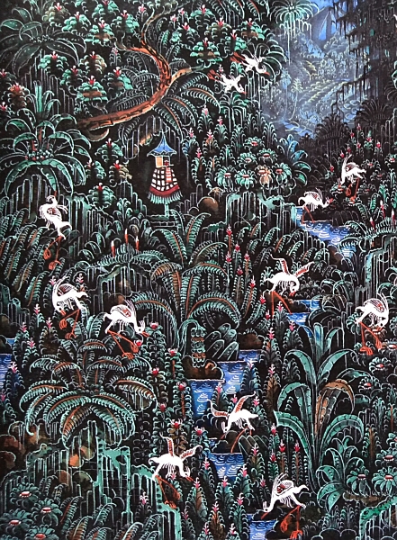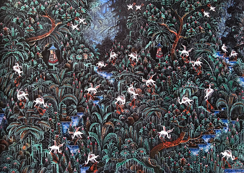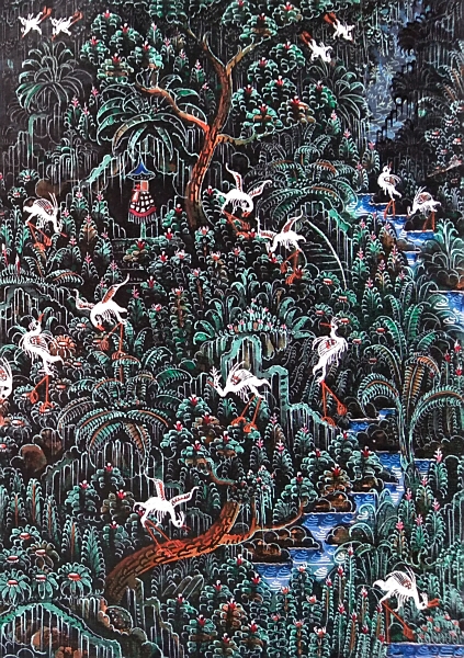 仄暗い谷間の森とそこを住処とする白鷺の群れ、背景にはバリ島を彷彿させる棚田風景が、が画面全体に隙間なく描き込まれた細密画作品です。ウブドの北にあるプトルウ村は白鷺の群生する森であることで有名で、朝夕は付近の水田に通う白鷺の群れが飛翔する姿が見られます。腕の良い細密画の職人画家による貴重な逸品です。