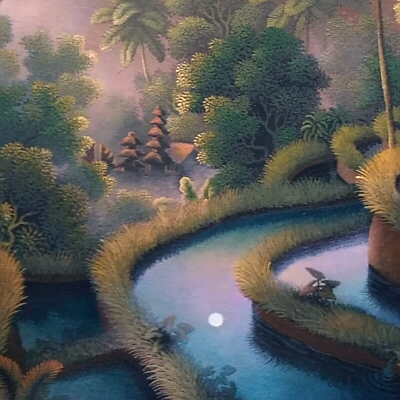 夜がまだ明けきらない山間の棚田の小路を行く親子は、お供え物をもって遠くの神社へと向かっているようです。黎明の空を反射して、薄いピンク色に輝く水面に映った月は、心の鏡となって観る者を絵の世界へと運んでくれるような気がします。ひんやりとした空気が流れる朝靄の棚田の心象風景画を描いた珠玉の作品です。
