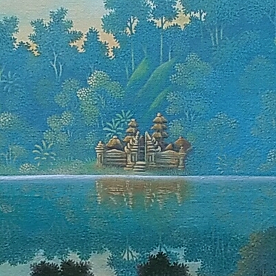 鏡のような湖面に映った森と寺院の影が印象的で、全体が美しいブルー基調の心を洗われるような作品です。深い奥行きと遥かな広がりを感じさせてくれる雄大な風景画です!