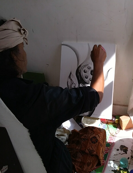 真っ白なキャンバス/紙に、流れるような筆使いで美しい花や女たちが一気にしかも繊細な描写で描きだされていく光景にはとても驚かされました。氏にとってアートとは脳内に浮かび上がった(創造した)イメージをキャンバスに映し出すことであり、それが一つの作品となって完成したものがアート作品とのこと。記憶の中から引っ張り出してきて描かれたものは、自分にとってはコピーのようなものと言っておられました。泉のように湧き出てくるインスピレーションを、産みの苦しみの中でイメージとして創造する姿は時に苦悩に満ちていました。鋭い眼光のKetut氏はその後さっさと釣りに出かけました。何故かバリ島では魚釣りが好きな画家さんと出会うことが多いようです。
