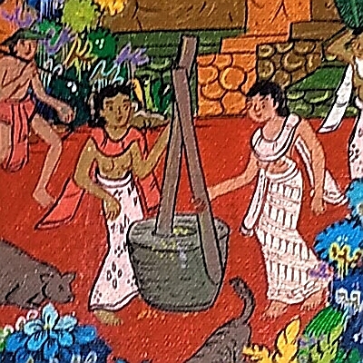「ヤング・アーティスト」と呼ばれる細密画スタイルは、1950年代に興ったオランダ人画家アリー・シュミットを師とする青年アーティストたちの画法です。バリ島の農村生活や自然風景が、画面全体に隙間なく描かれ、溢れる光と鮮やかな色彩で陰影をつけずに描かれるのが特徴です。