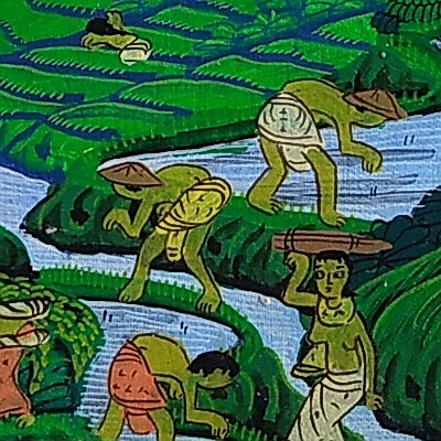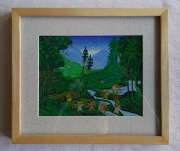 「ヤング・アーティスト」と呼ばれる細密画スタイルは、1950年代に興ったオランダ人画家アリー・シュミットを師とする青年アーティストたちの画法です。バリ島の農村生活や自然風景が、画面全体に隙間なく描かれ、溢れる光と鮮やかな色彩で陰影をつけずに描かれるのが特徴です。