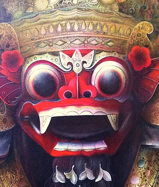 バリ島ウブドのモンキーフォレスト通りアトリエ件ギャラリーを構える地元プンゴセカン村の画家、Sudana氏が画家としてデビューした頃の記念的作品です。聖獣バロンはバリ・ヒンドウ経独自の象徴的な獣神で、何処の村にも聖体が安置され、魔女ランダと共に村の神社の祭礼には欠かせない存在です。この作品は、間違いなく氏の類まれな技量を存分に発揮して描かれた、滅多にお目にかかれないほどの逸品ですよ!