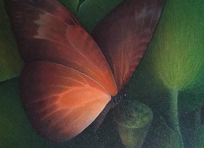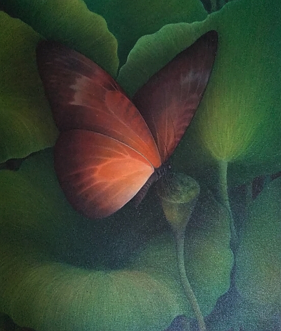 一羽の蝶とロータスが淡い色調の絶妙のコントラストで描かれた、優雅で静謐な画風の作品です。氏の類まれな技量と感性を存分に発揮して描かれた、滅多にお目にかかれない逸品です!
