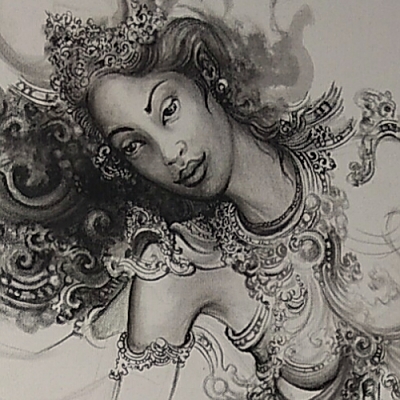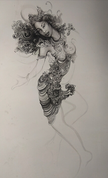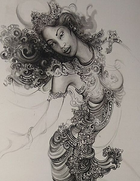 真っ白なキャンバスに、流れるような筆使いでボディラインを一気に描き出し、鮮やかな彩色で衣装を重ねて行く。魔法のような筆さばきで、次々と美しい女たちがこの世に送り出されて行く光景には、背筋がゾクゾクするほどの興奮を覚えました。鋭い眼光のKetut氏は、その後さっさと釣りに出かけたのでしたが、無論、迷わず購入させていただきました。