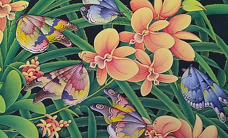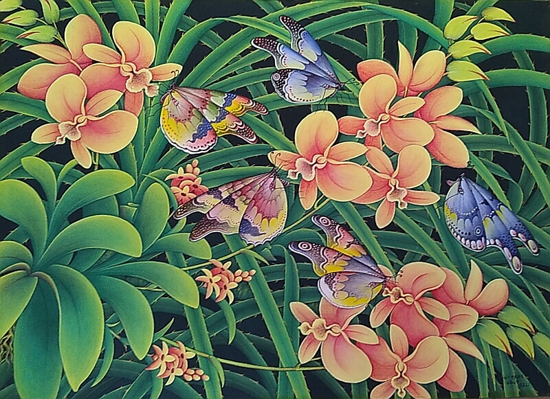 野生ランの群生する熱帯の花園と、色鮮やかな蝶の群れ・・・熱帯の楽園に迷い込んでしまいそうな魅力的な作品ですね!(画面中央と左下の白くぼやけた部分は光の反射によるものです)