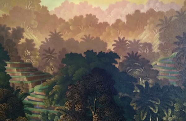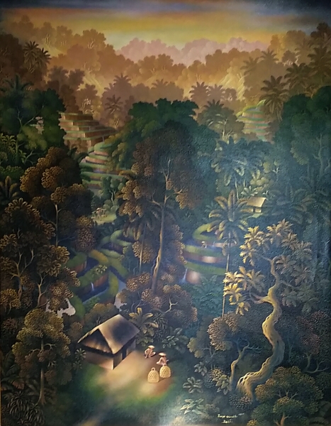 Warditaさんの住むパヤンガン村はキンタマーニ高原の南山麓にあり、当にこの絵のような棚田風景が広がる山間の美しい土地でした。山間の棚田に朝の陽ざしが差し込む一瞬前のひんやりとした静寂な空気が閉じ込められた珠玉の作品です。