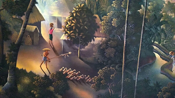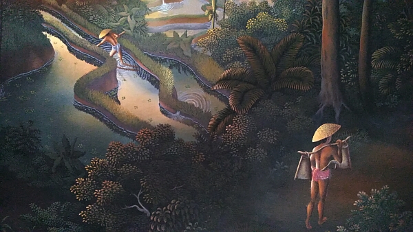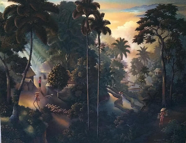 Warditaさんの住むパヤンガン村はキンタマーニ高原の南山麓にあり、当にこの絵のような棚田風景が広がる山間の美しい土地でした。山間の棚田に朝の陽ざしが差し込む一瞬前のひんやりとした静寂な空気が閉じ込められた珠玉の作品です。