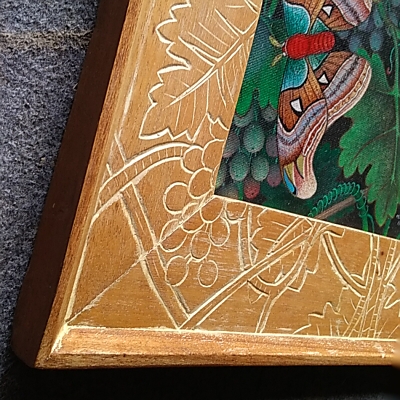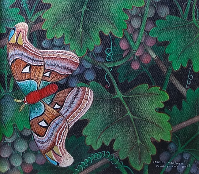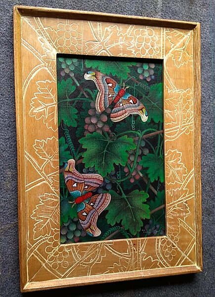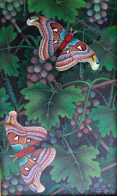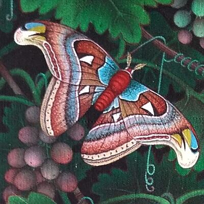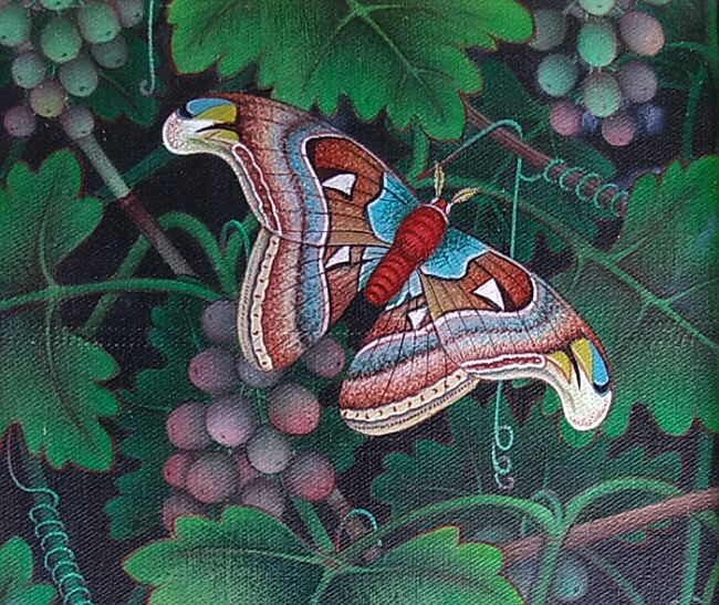 葡萄の葉と果実がぼんやりと薄暗い背景となり、極彩色の羽を纏った2羽の蝶とが鮮やかなコントラストで描かれていて、