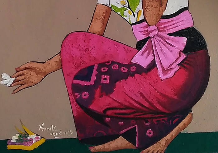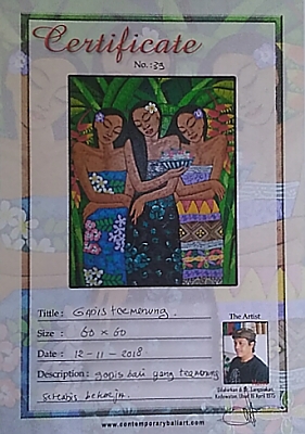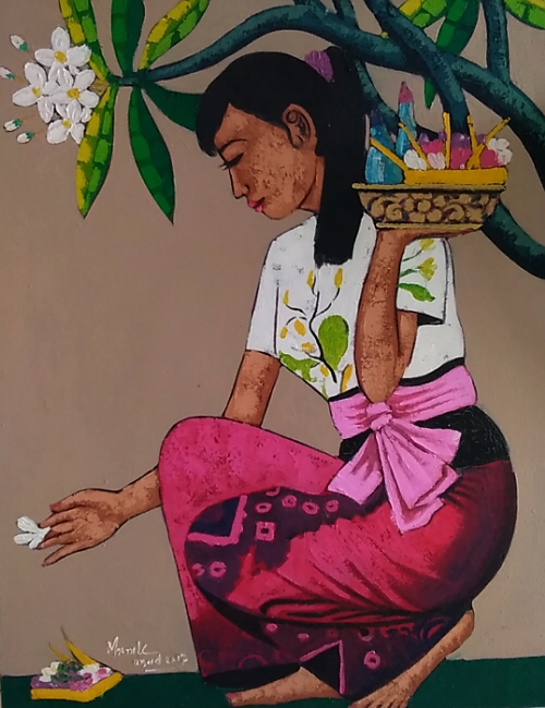 1975年ウブド郊外のクデワタン・ラシアカン村の農家に生まれる。少年時代は主にヤング・アーティスト スタイル画を学び、美術高校卒業後は独自の画風の創作を目指し、人物の目を伏せることにより、内面の感情を表現する画風を創作する。バリ島のホテルやギャラリーでの個展の実績あり。 |