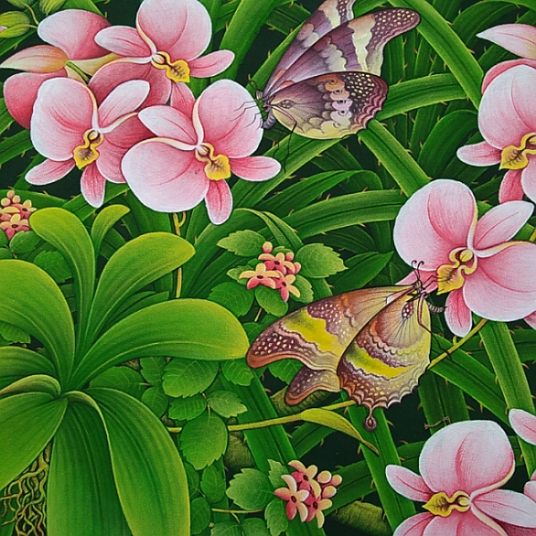 大画面の作品で、バリ島では月の蘭と呼ばれるピンクの蘭と3羽の蝶が画面全体に隙間なく描き込まれた豪華な作品です。花弁と枝葉の一つ一つが丁寧に描かれていて、お部屋がランの花園になったような気分にさせてくれる素敵な作品です!