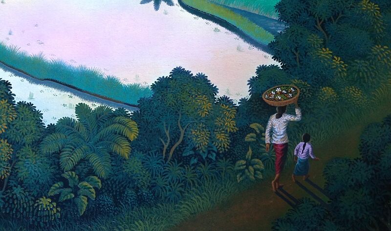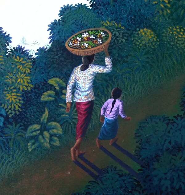 早朝の山間の道を、花飾りが入った籠を頭に乗せ歩く母と娘はSRINIさん自身の姿ではないでしょうか?棚田には豊穣を約束してくれるように満々と水が張り、明け始めた空の光がピンク色に反射して、夢の中に迷い込んだような気分にさせてくれます!川が流れる谷間の向こうには遥かな山々が連なり、雄大で奥行きのある風景が広がっています!