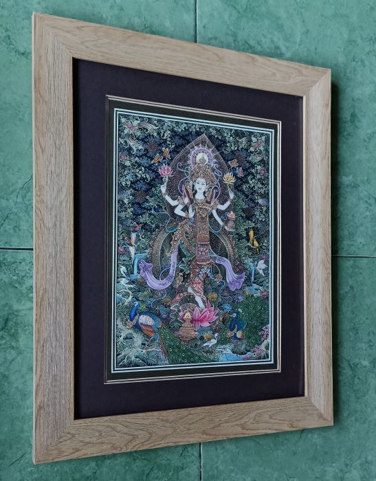 この作品はチーク色の木目のグラスファイバー額縁(紙マット+アクリル板付)に入れてお届けします。 バリ島産の額縁やアクリルボードに付いての説明はこちらを参照ください。 → バリ島のフレームに付いて