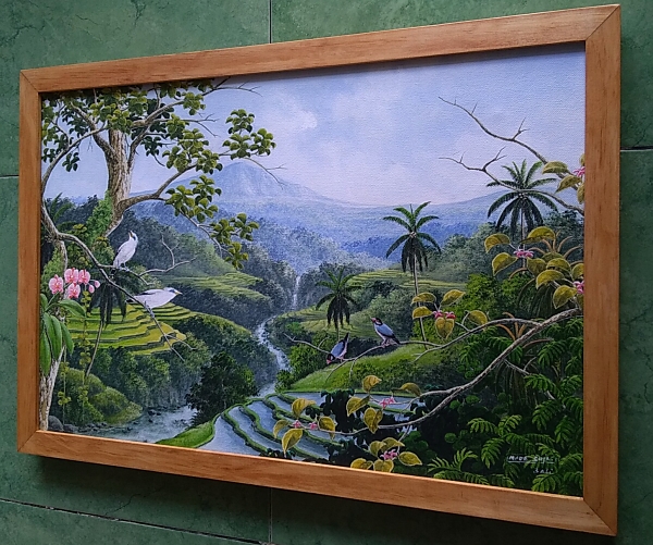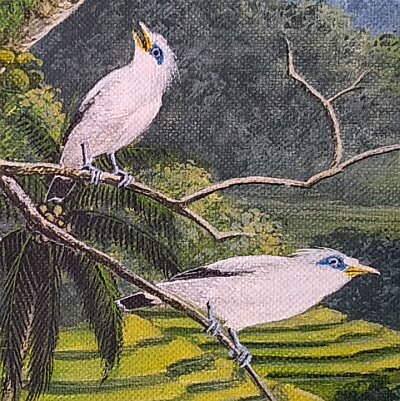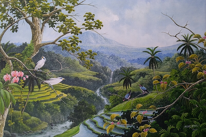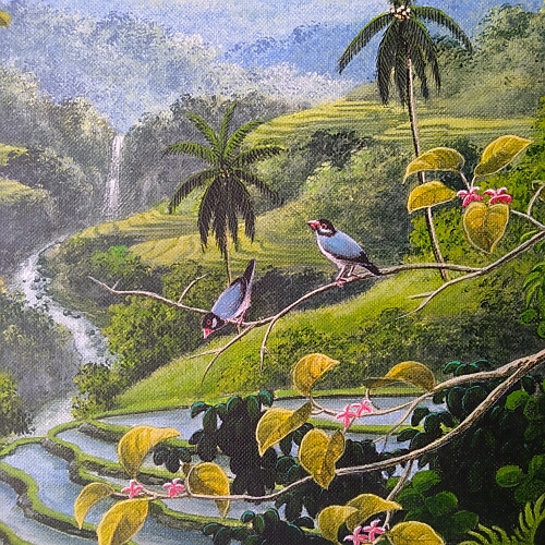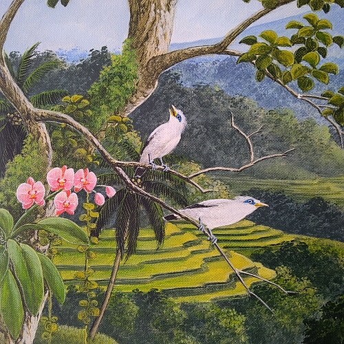 透明で遠近感に溢れた画風で、熱帯雨林に囲まれた火山島バリ島の雄大な自然が窓の外に広がるように描かれています。画面の左側の白い野鳥はカンムリシロムク(バリスターリング)で右側には文鳥が描かれいます。どちらもバリ島の自然に生息する野鳥ですよ!