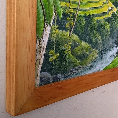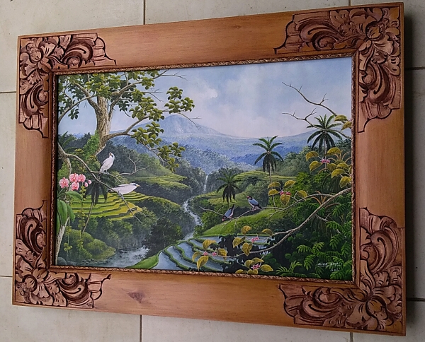 この作品はバリ島の香りが漂う重厚な無垢の木彫額縁に入れてお届けいたします。