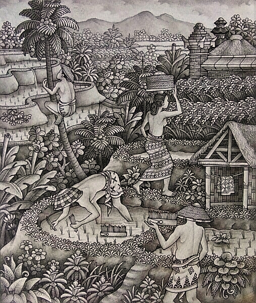 バリ島ののどかな農民の暮らしを描いた作品で、流石に上半身裸で腰巻姿の若い女性は見ませんが、基本的には今もこんな感じの農村風景が広がっています!