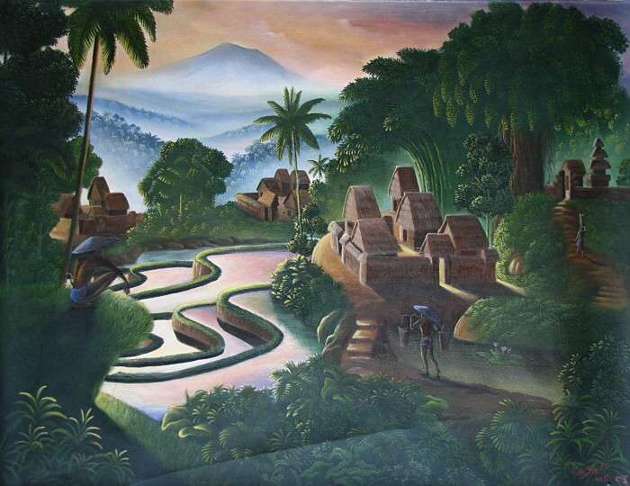 光とその影を巧みに操り描かれた風景画は、バリ絵画の父と慕われるドイツ人画家ワルター・シュピースが残したもので、熱帯の農村部特有の朝夕の水蒸気と光線が醸し出す幻想的な世界を絵の中に閉じこめたものです。