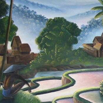 朝霧立ち込めるのどかなバリ島の農村風景画は写実的で、実際の姿のように見えながらも夢の中に漂っているような不思議な世界を創りだし、光と闇を操る新たな絵画スタイルへと昇華されています。