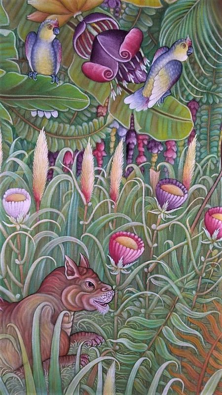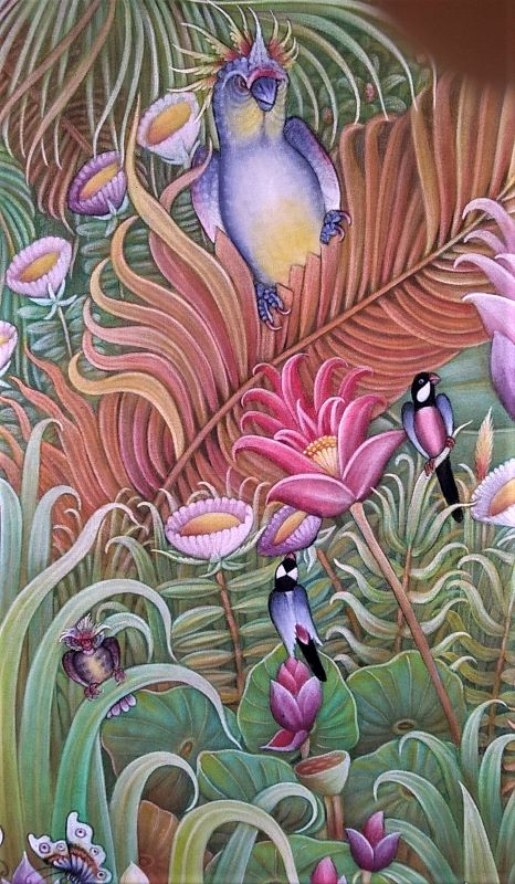 幼少のころに高名な伝統絵画の画家である祖父(注)の影響を受け、そのまま芸術絵画の世界に進む。花鳥画の世界に魅了され自然の色合いを表現するために主に身近にある植物を原料にした絵の具とアクリル絵の具を混合したものを使い始める。画面いっぱいに熱帯植物と野鳥が美しいグラデユエーションで描かれた優雅な画風に心が和ませられる思いです。