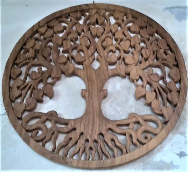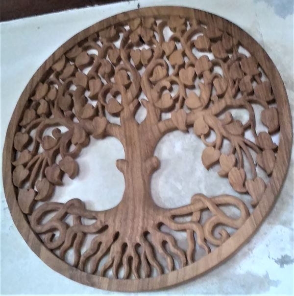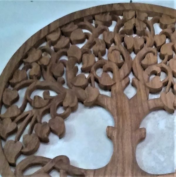 高級家具材として人気の無垢のスアール材(紫檀)を使った繊細な透かし彫りの壁掛です。経年して十分に乾燥し重量も軽くなり、変形やヒビ割れの心配はありません。裏側に吊り金具を取り付けてあります。