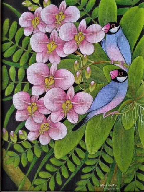 Dewa Martin 作品 : 二羽の文鳥と胡蝶ラン