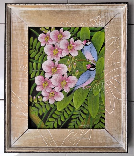 Martin氏の作品には文鳥をテーマにした作品が多く、クリッとした黒い大きな瞳の文鳥がとっても可愛いですね!絵の植物と一体の模様が彫られた、素朴な木製額縁がとても良く似合っています。