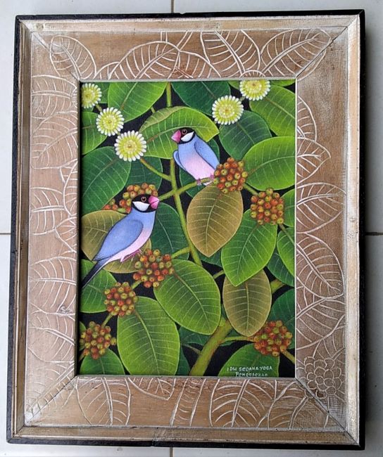Martin氏の作品には文鳥をテーマにした作品が多く、クリッとした黒い大きな瞳の文鳥がとっても可愛いですね!絵の植物と一体の模様が彫られた、素朴な木製額縁がとても良く似合っています。