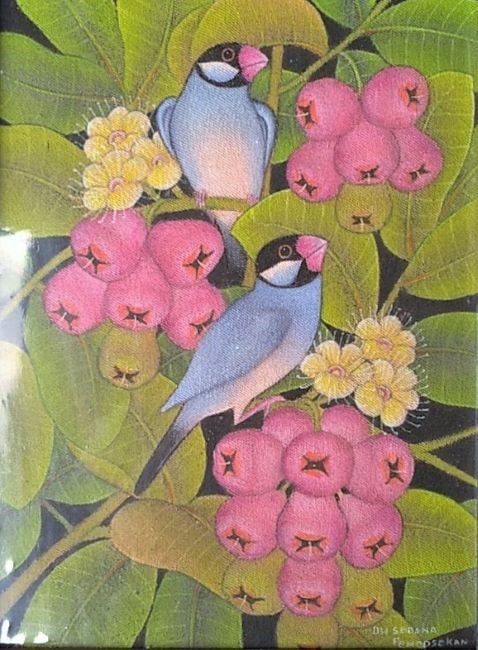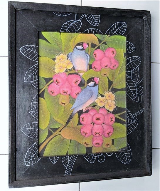 Martin氏の作品には文鳥をテーマにした作品が多く、クリッとした黒い大きな瞳の文鳥がとっても可愛いですね!絵の植物と一体の模様が彫られた、素朴な木製額縁がとても良く似合っています。