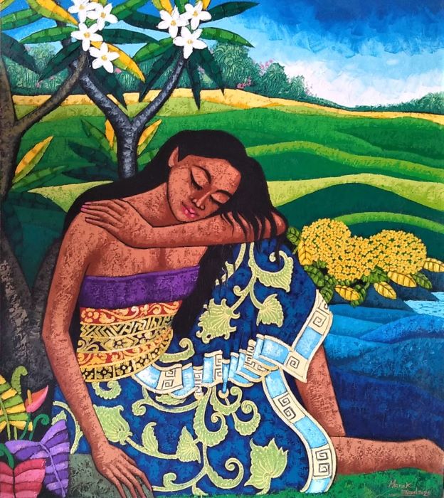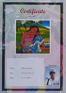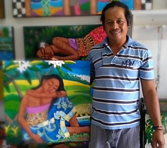 1975年ウブド郊外のクデワタン・ラシアカン村の農家に生まれる。少年時代は主にヤング・アーティスト スタイル画を学び、美術高校卒業後は独自の画風の創作を目指し、人物の目を伏せることにより、内面の感情を表現する画風を創作する。バリ島のホテルやギャラリーでの個展の実績あり。 |