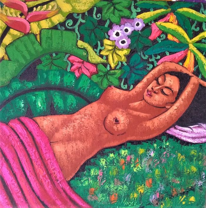 MANIKさんの作品を初めて目にしたのは2007年のこと。鮮やかな色彩と濃厚でエキゾチックな魅力に溢れた作品群に一目惚れしたことを思い出します。木枠のファブリックパネルを用意し、それに張り付けて壁に架けてみましょう。お部屋の中に熱帯の楽園が出現することでしょう!