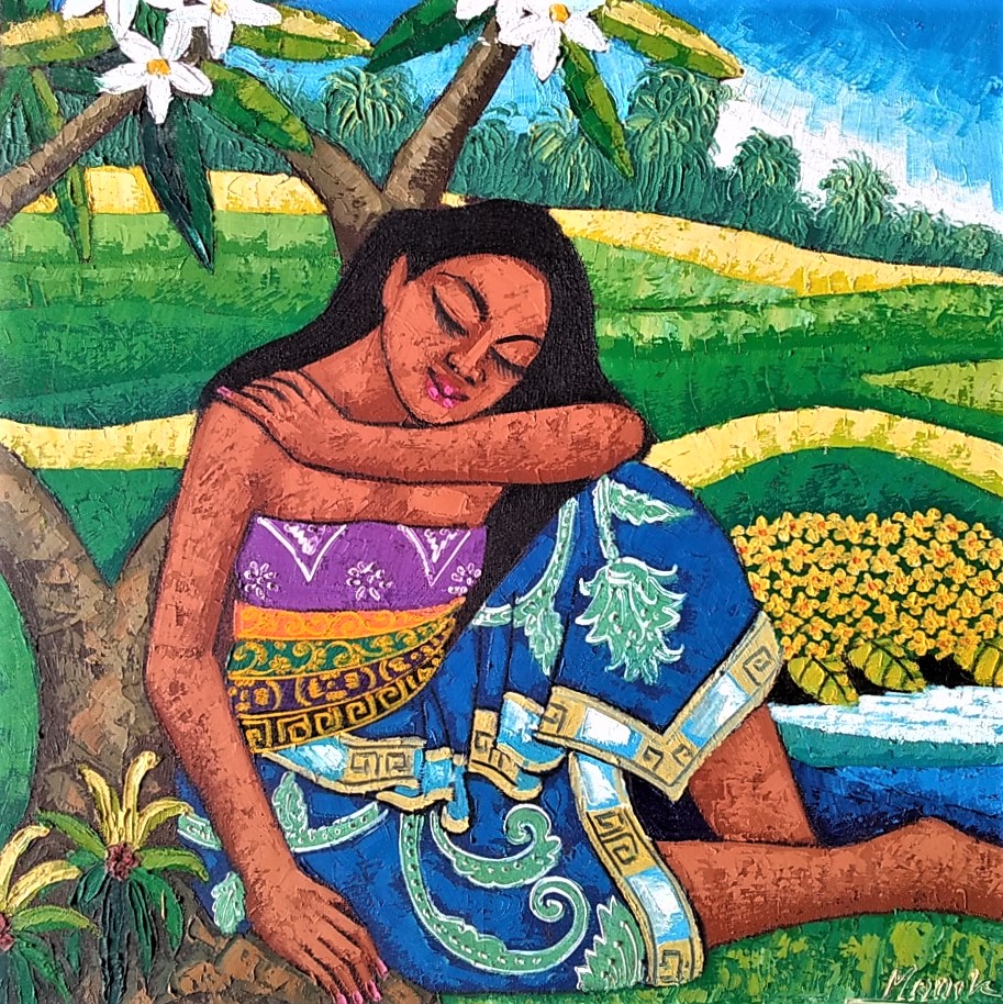 1975年ウブド郊外のクデワタン・ラシアカン村の農家に生まれる。少年時代は主にヤング・アーティスト スタイル画を学び、美術高校卒業後は独自の画風の創作を目指し、人物の目を伏せることにより、内面の感情を表現する画風を創作する。バリ島のホテルやギャラリーでの個展の実績あり。 |