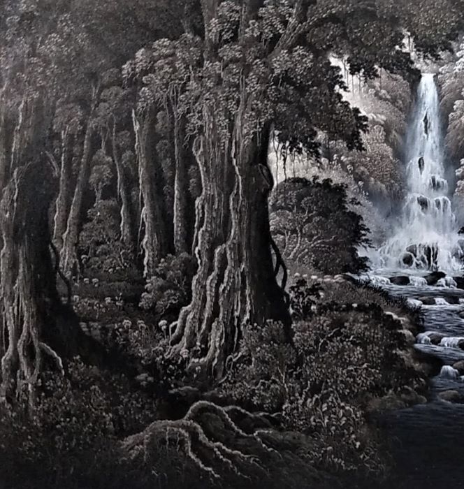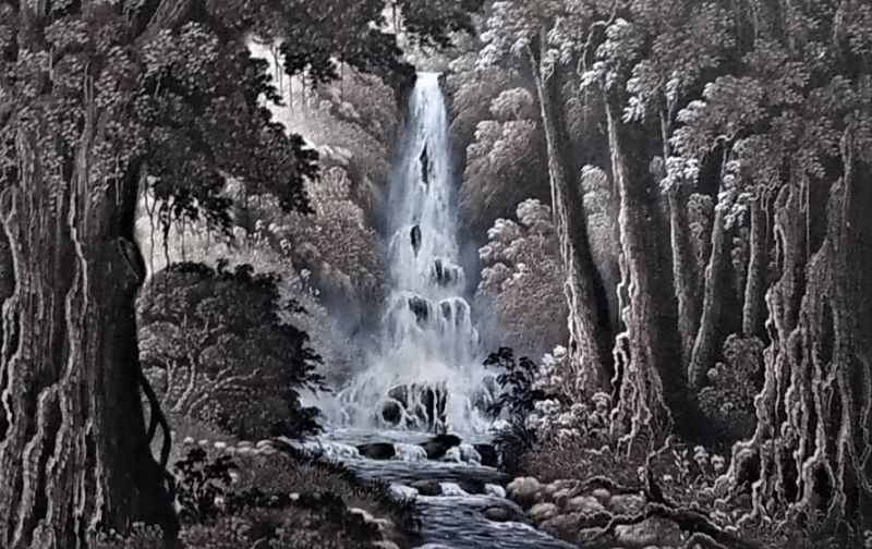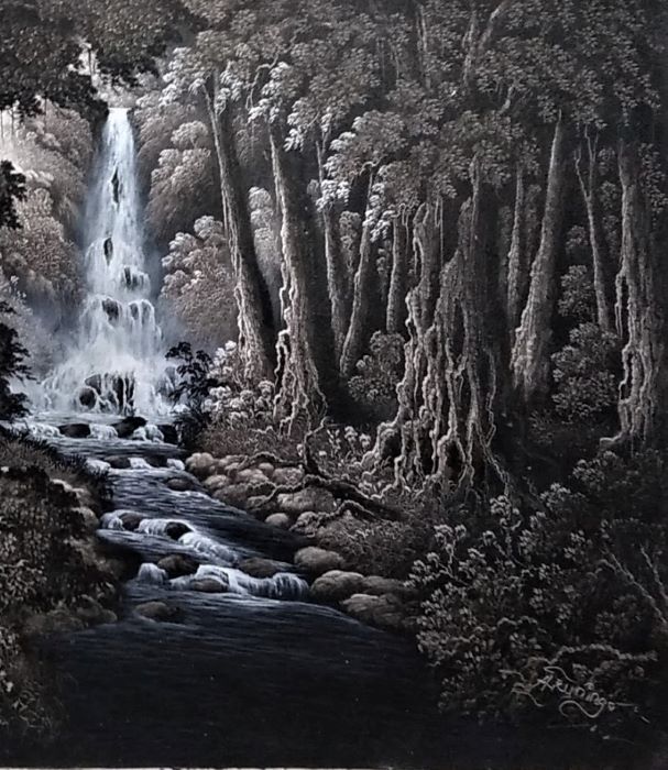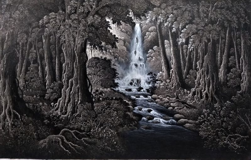 幽玄な熱帯の森の奥深く、水音が聞こえてきそうな清冽な滝の姿は、観る人の心を洗い流し癒してくれることでしょう。