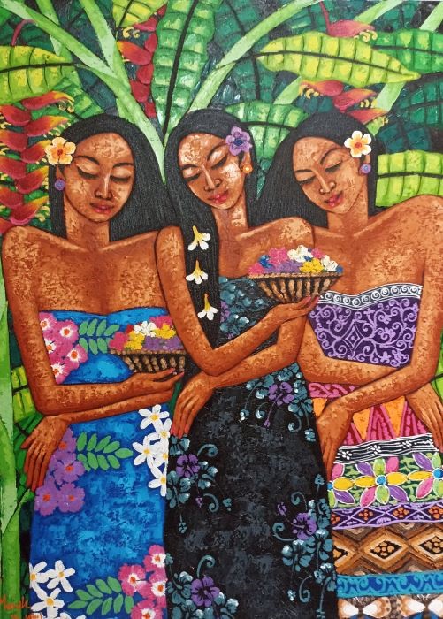 1975年ウブド郊外のクデワタン・ラシアカン村の農家に生まれる。少年時代は主にヤング・アーティスト スタイル画を学び、美術高校卒業後は独自の画風の創作を目指し、人物の目を伏せることにより、内面の感情を表現する画風を創作する。バリ島のホテルやギャラリーでの個展の実績あり。 |