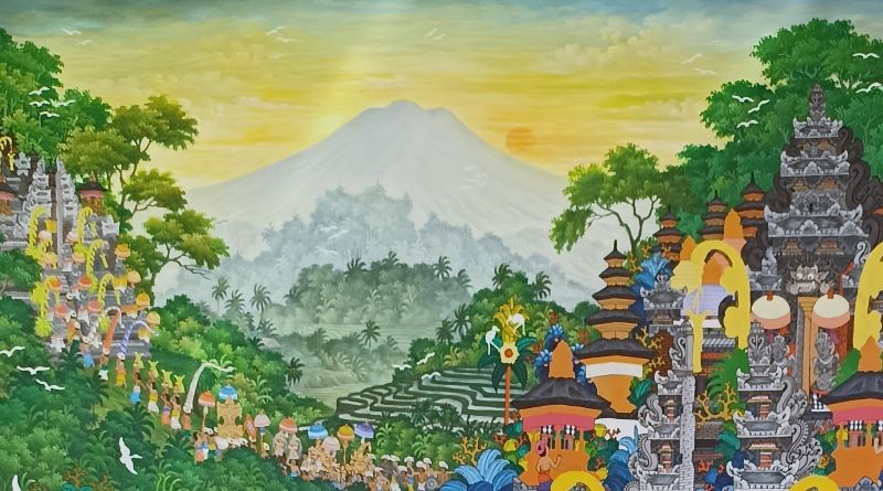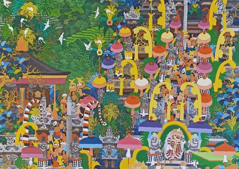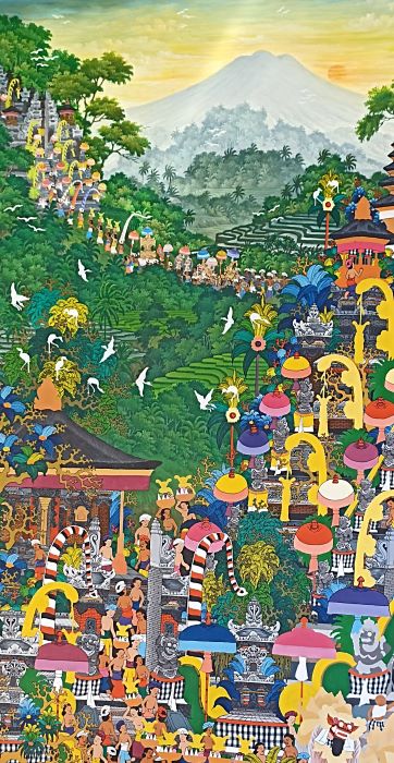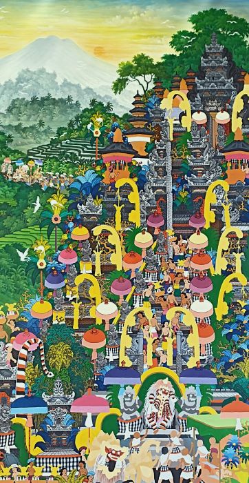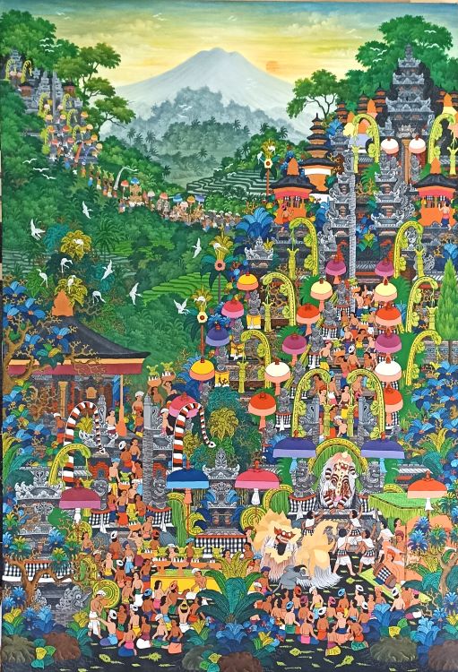 人々の祭礼の行列が村々の寺院から遠くの山上の寺院へと続き、遥か彼方には信仰の源でもある雄大な火山が永遠の時の流れを感じさせてくれます。緻密で鮮やかな色彩の描写と、遠近感のある雄大な風景のコントラストが見事な珠玉の作品。見る度に新しい発見があり、過ぎた日のバリ島の旅の思い出にお勧めです! アッ 未完成でした!