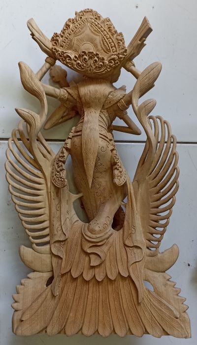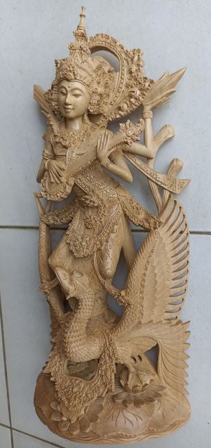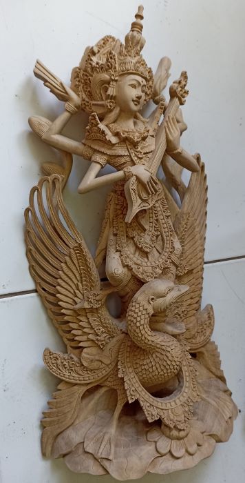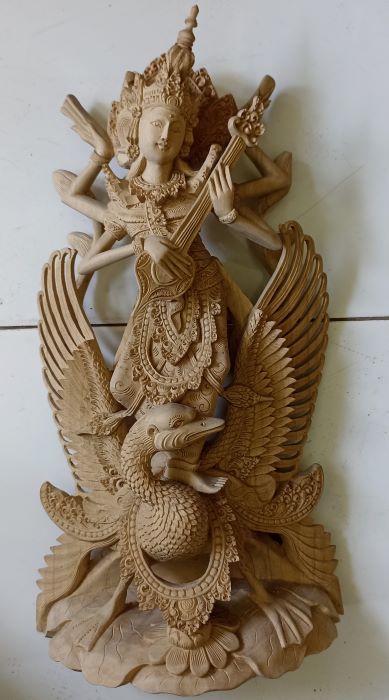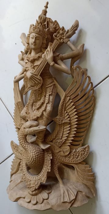 純白の木肌のクロコダイルウッドには良く似合う女神像です。女神サラスワティは学問と芸術の神様として人気があります。祝日かどうか分かりませんが、バリ島には「女神サラスワティの日」があり、この日は本を読んだり、音楽を奏でたり聴いたりすることが禁止されているとのこと。年に一度は女神様に休養を与えようとの配慮からでしょうか…。見事な出来栄えとしか表現できない美しい女神の木彫像です!
