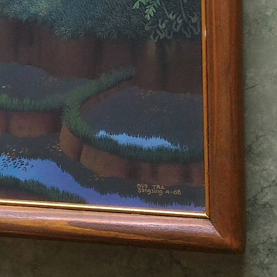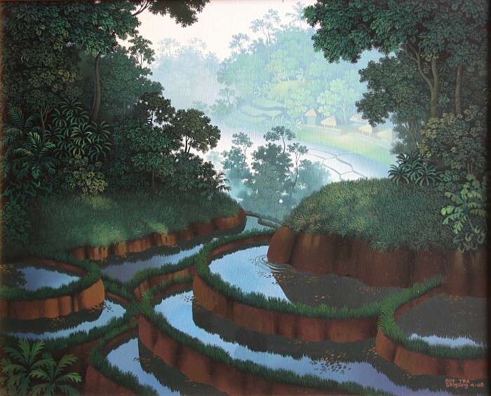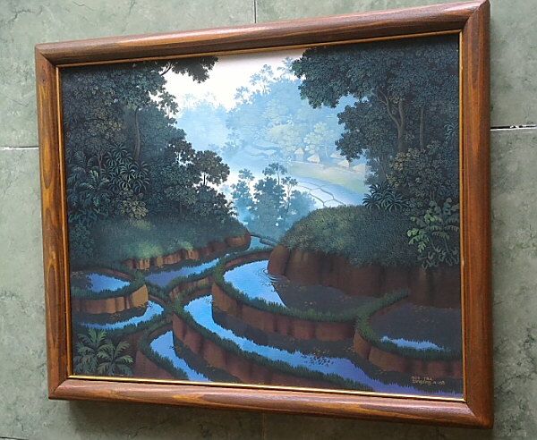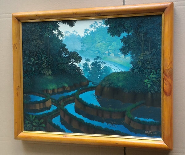 ウブドのギャラリーLIPで開催された「WALTER SPIES STYLE PAINTING展」に展示された作品の中の一枚です。バリ島の山間に広がる朝靄の棚田風景が幻想的に描かれた、光と影の絶妙なバランスが魅力的な作品です。
