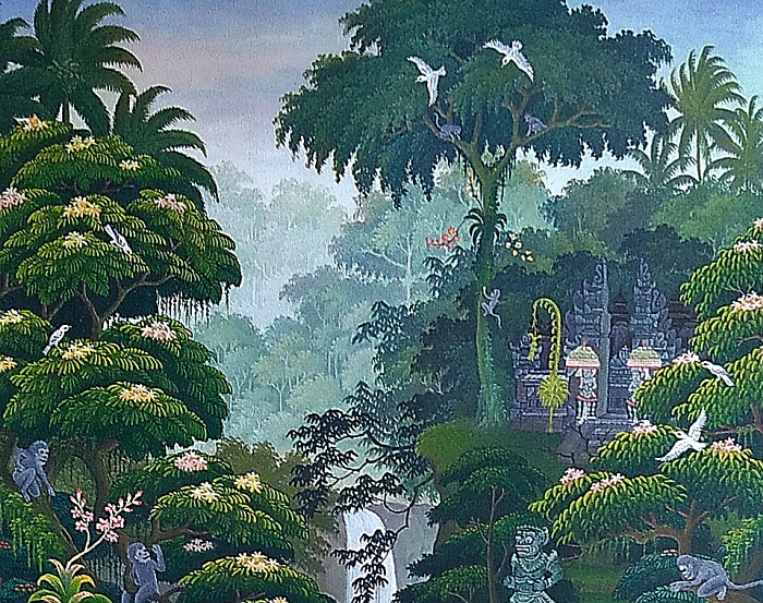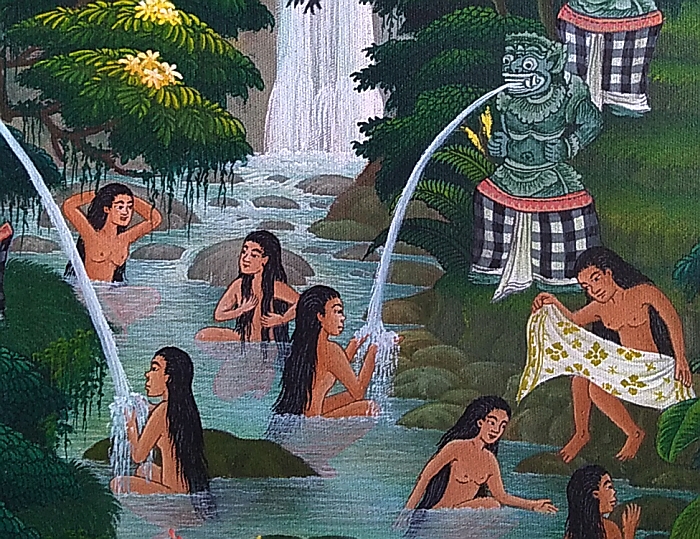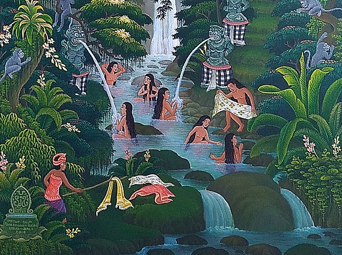 ジャワ島から伝わったラジャ・パラという物語を主題にした作品で、日本の羽衣伝説と同じ内容のようです。ラジャ・パラは天女の羽衣を盗み取る若者の名前で、めでたく七人の天女の一人をお妃に迎えることができました。ラジャ(王)ですので高貴な身分の青年でしょうか。