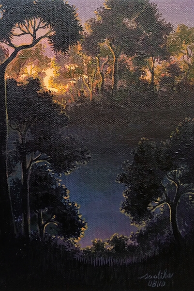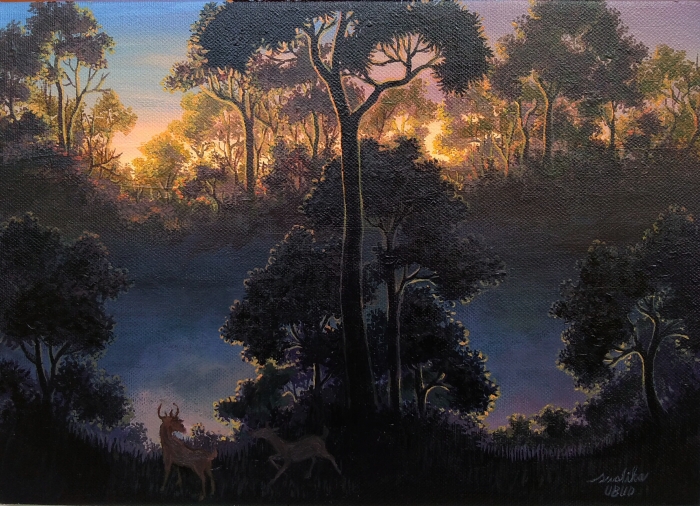 油彩画作品 「夜明けの森」