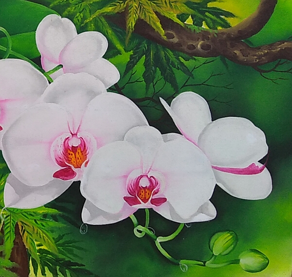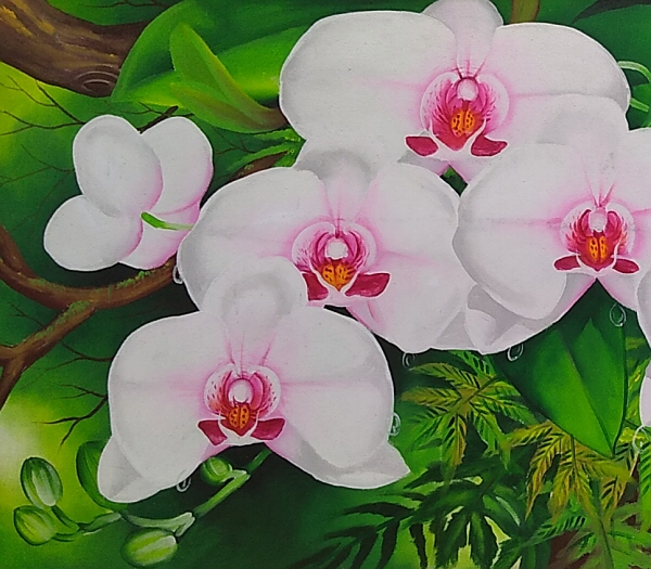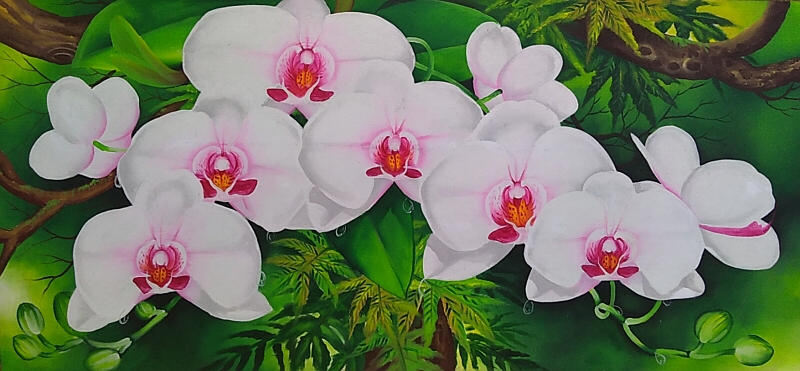 野生ランの群生する熱帯の花園と、色鮮やかな蝶の群れ・・・熱帯の楽園に迷い込んでしまいそうな魅力的な作品ですね!(画面中央と左下の白くぼやけた部分は光の反射によるものです)