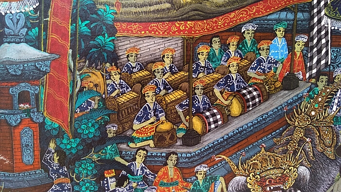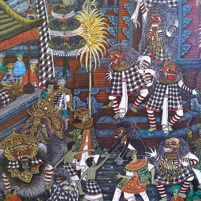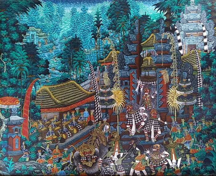 「ヤング・アーティスト」と呼ばれる細密画スタイルは、1950年代に興ったオランダ人画家アリー・シュミットを師とする青年アーティストたちの画法です。バリ島の農村生活や自然風景が、画面全体に隙間なく描かれ、溢れる光と鮮やかな色彩で陰影をつけずに描かれるのが特徴です。