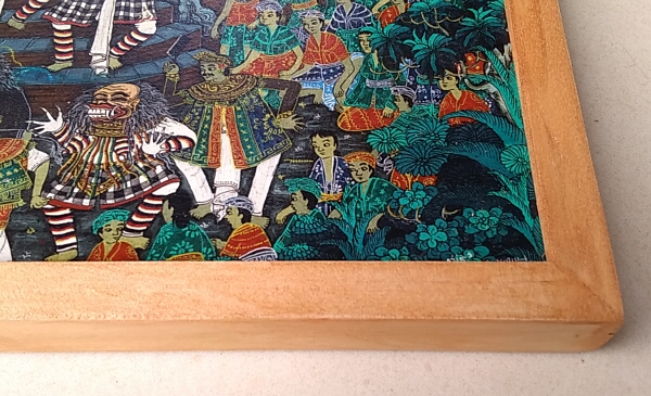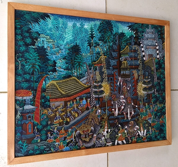 年号の表記がないため正確な制作年は分かりませんが、鋭い描線と多彩でやわらなパステル調の色使い、見事な色調のコントラストなどから推察して、90年代に製作されたものと思われます。近年バリ島の絵画マーケットに出回っている粗雑なヤング・アーティスト画の作品群とは別次元の作品であることがお分かりになると思います。