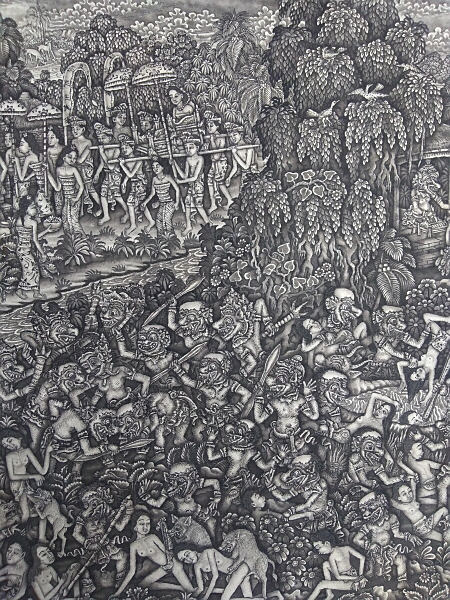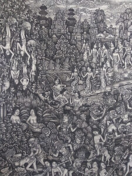 バトウアン絵画とは、1930年代にバリ島バトウアン村に興った墨絵のような細密画で、カマサン・スタイルと近代ヨーロッパの絵画技法が融合してできた技法です。紙や布に中国の墨と毛筆を使って濃淡をつけ、画面に隙間なくびっしりとヒンドウ神話や農村社会の生活風俗が描かれます。西洋の遠近法を画家独自の解釈により斜め上から地上を見下ろすような目線で描かれるのが特徴。(近年はアクリル絵の具も使うようになってきました)
