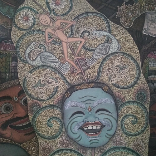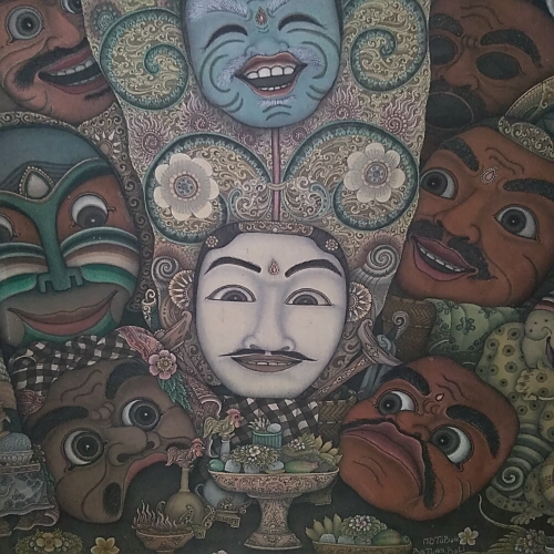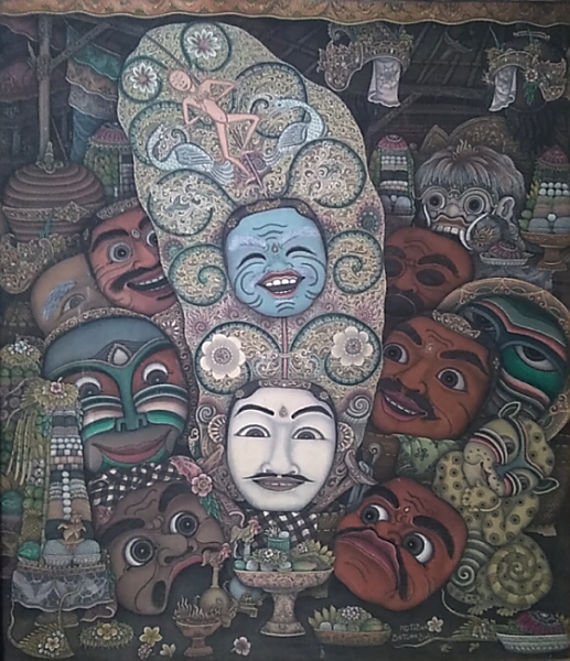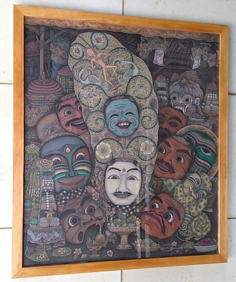 バリ絵画の巨匠ニョマン・メジャさんのお弟子さんの一人で、バリ島農民の日々の生活をテーマにした作品が多い。村の祭礼の奉納劇に登場するトペン(仮面)の供養を描いた作品で、画面上部には超越的な神の象徴アチンティア(裸の人の姿)が見えます。